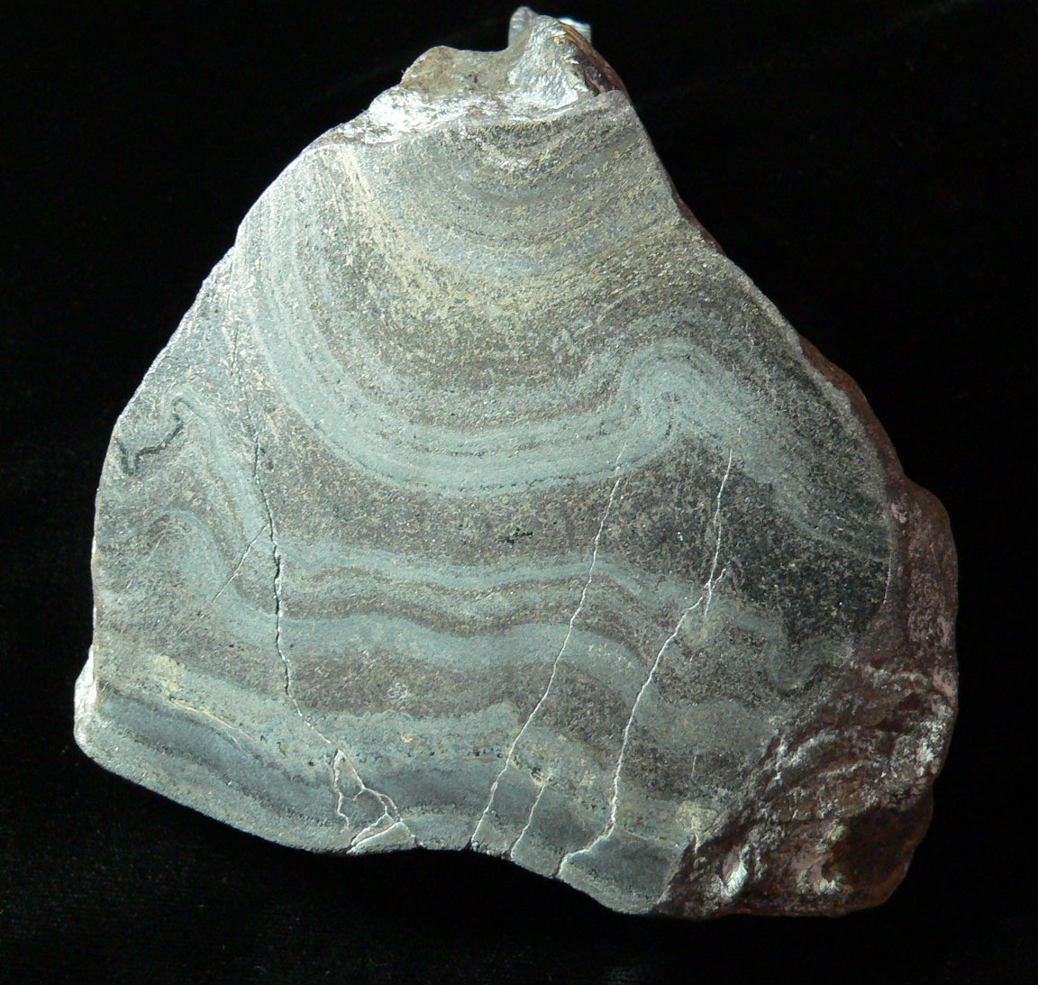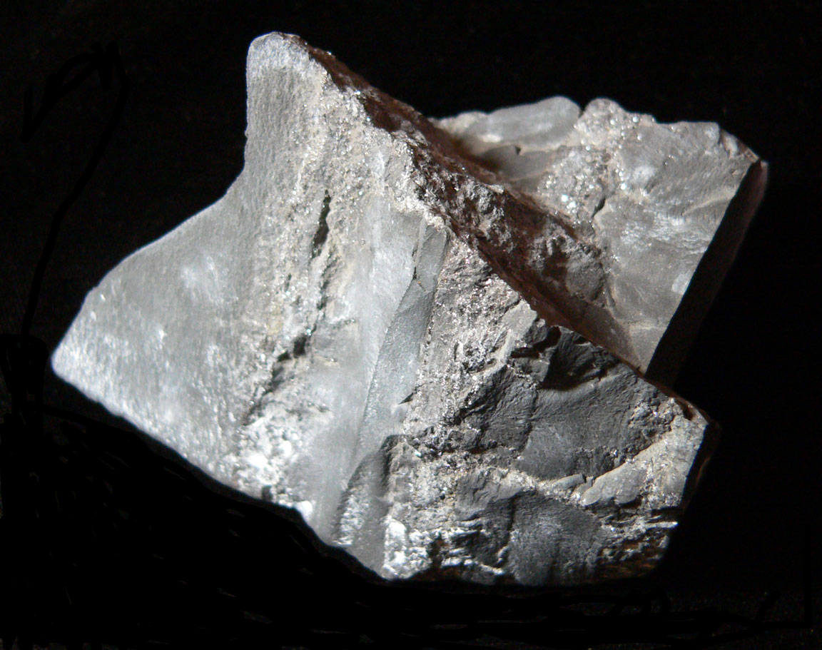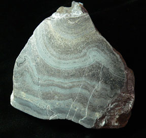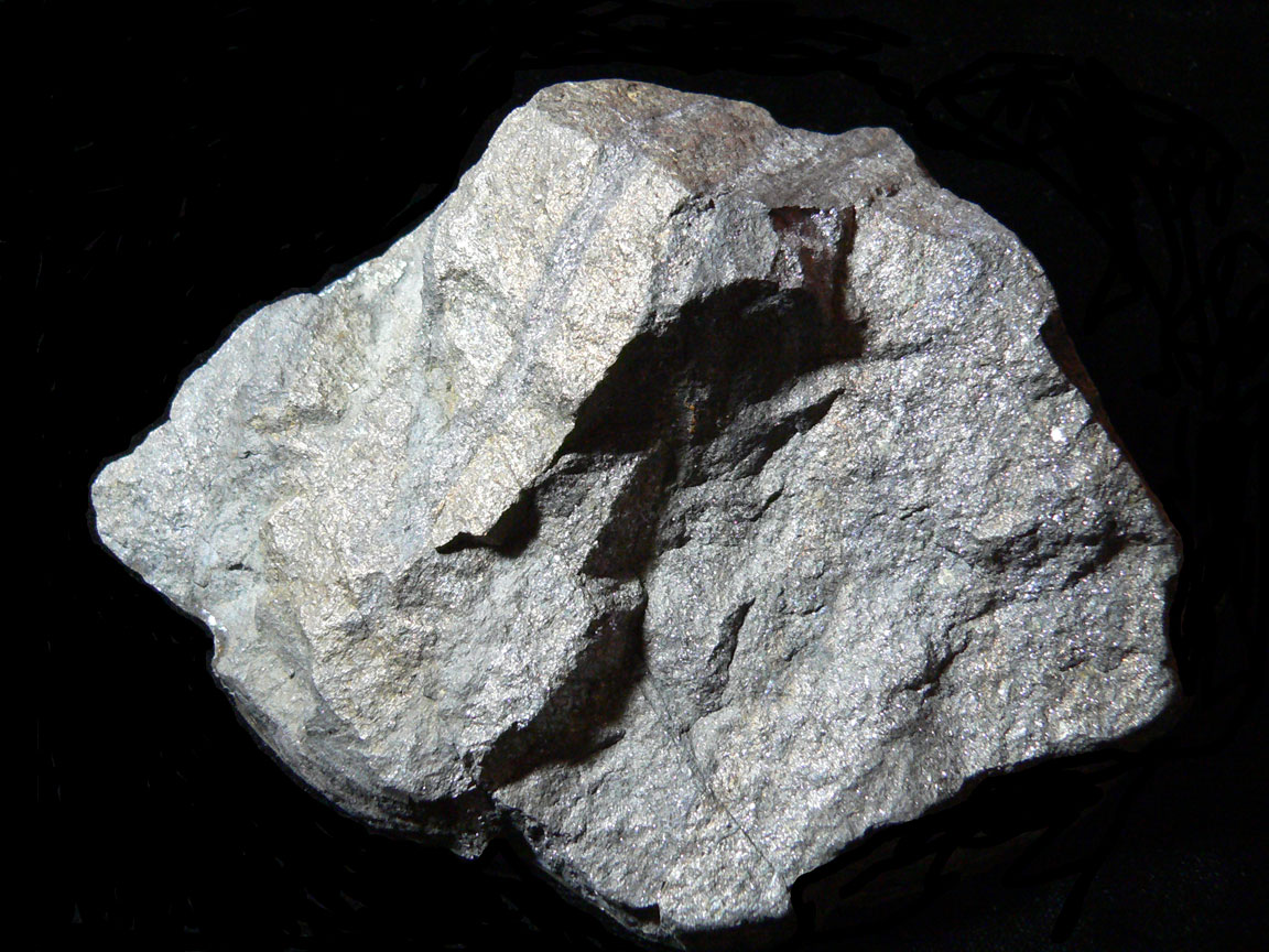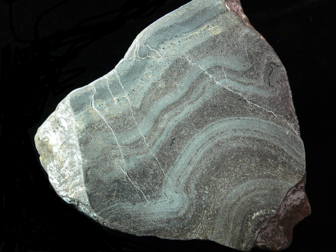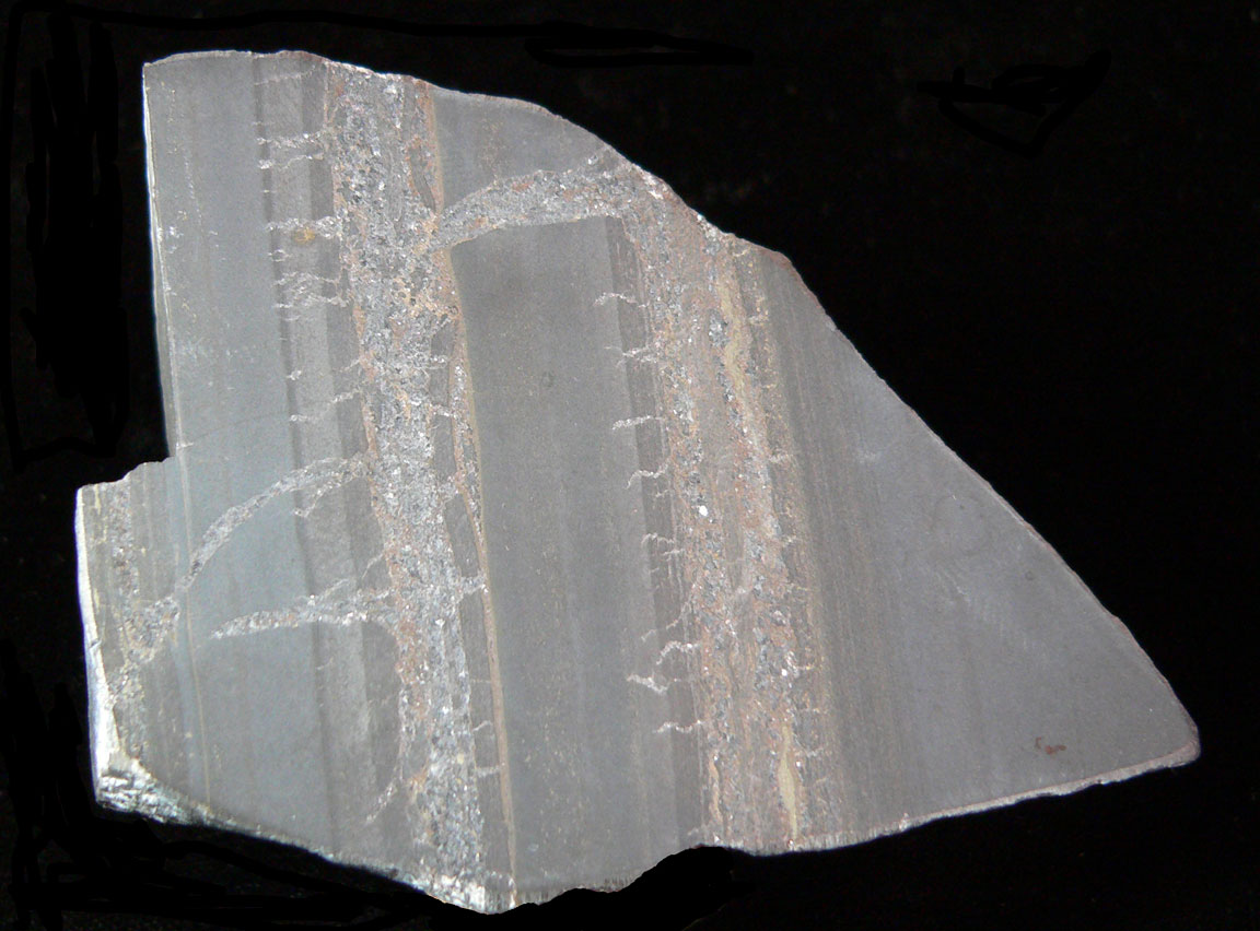 Silver - Zinc Ore Mineral # 5051 This is the base of the rock showing the veins traveling through the specimen. All 3 of the Apollo Mine Specimens are composed of a black matrix composed of andesite and dacite that hosted the mineralization at the mine. The mine has 5 minerals of importance. While silver and zinc are most abundant, copper, lead and gold were present in smaller amounts. It seems the the veins in this rock look like silver-zinc veins in many locations. |