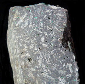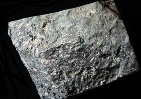 Franke Open Pit Copper Mine Ore Located in the Atacama Desert of Northern Chile near the coastal city of Taltal Specimen # 3000 7 x 8 10 cm 1406 grams $100 This rectangular specimen is a block of ore from the Franke ore body which is copper oxides which becomes sulfides with depth. Ore here is usually black from atacamite (a copper chloride hydroxide); it also contains copper, hematite, iron, magnetite and/or chalcocite. This ore is unique in that it contains gray, elongate flecks as found in this specimen. In bright light, some of the flecks appear shiny or silver. But the fleck contain not silver, but REE's including yttrium oxide. This specimen has been sawed on two sides for better exposure of the ore |