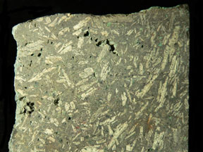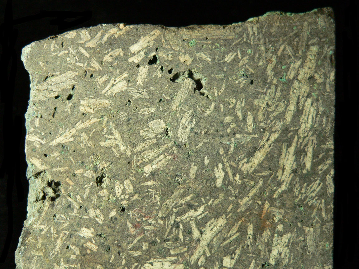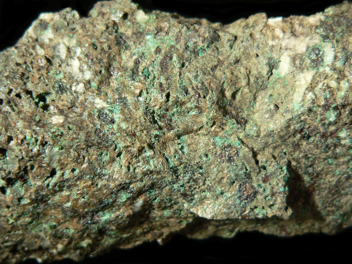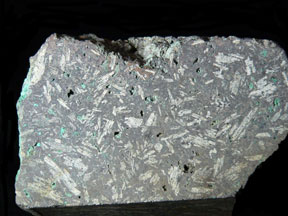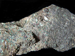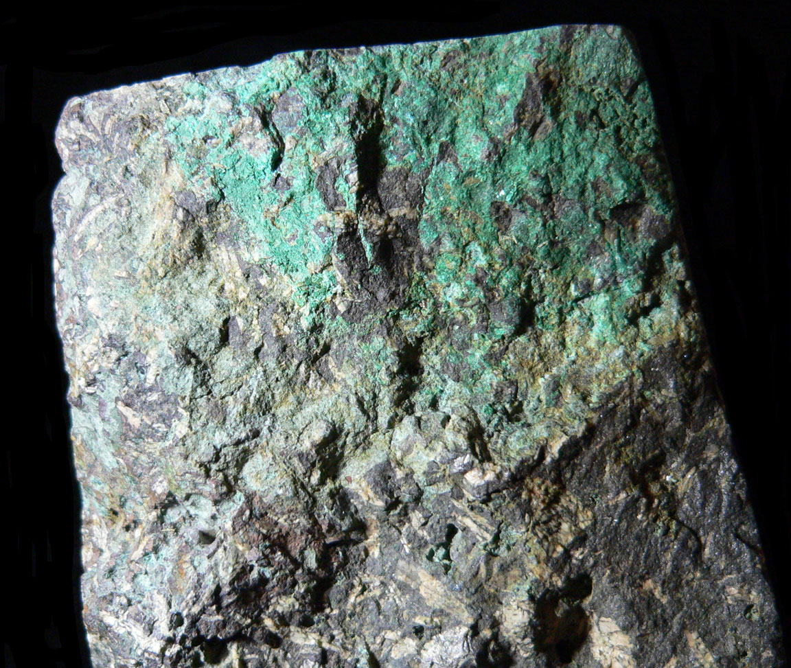 Franke Mine Ore Specimen # 3000 Here is one cut side showing the flecks and occasional malachite in the black atacamite and numerous spaces. On the very left side you can see the other flat cut side show in the image below. Any true white specks you find are gypsum. |