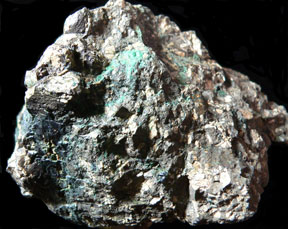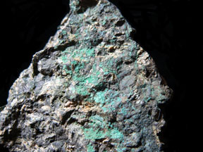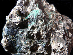 Franke Mine Ore Specimen # 3003 This is a closer view of this specimen. Atacamite (green) on the top center and black on the lower left. If you click on the specimen it will show up x 4. The black here does have a slight blue hue so it is probably chalcocite. |