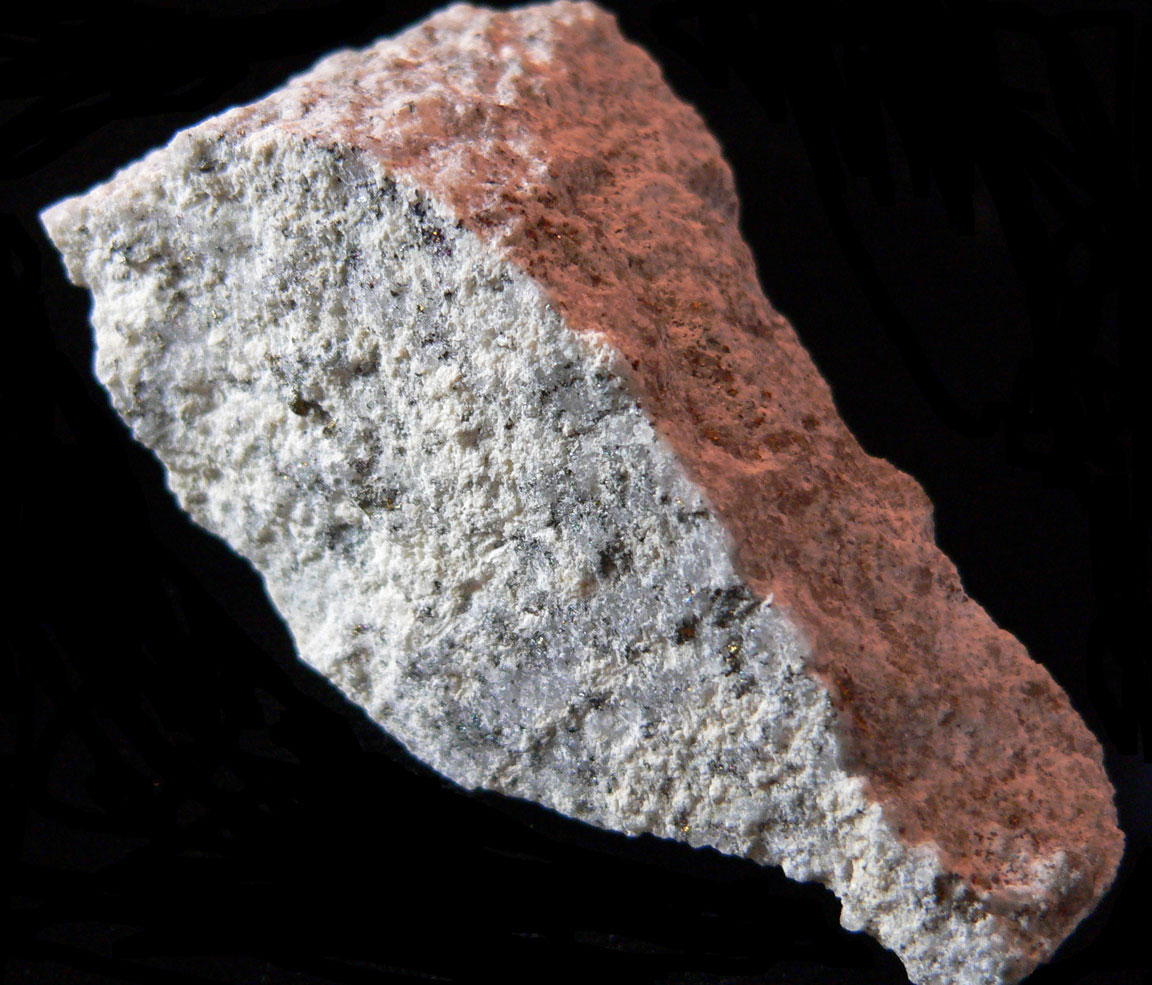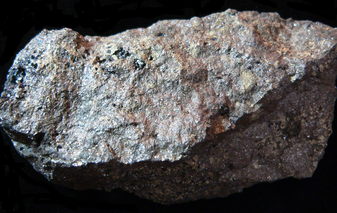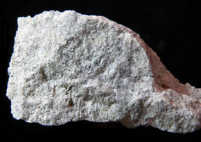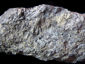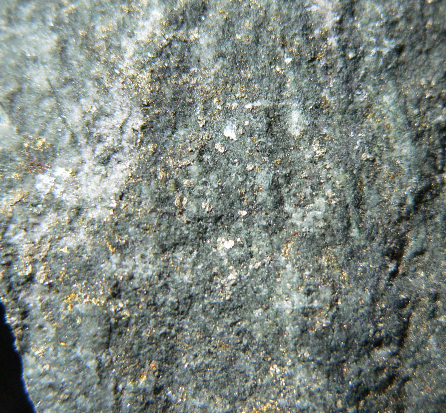 Sulphides in rhyolite Mineral # 3052 This is a close view of the back side of the specimen which has tiny flecks of sulphides, one brown streak which is iron oxides, and more small white bands of quartz and/or calcite. |