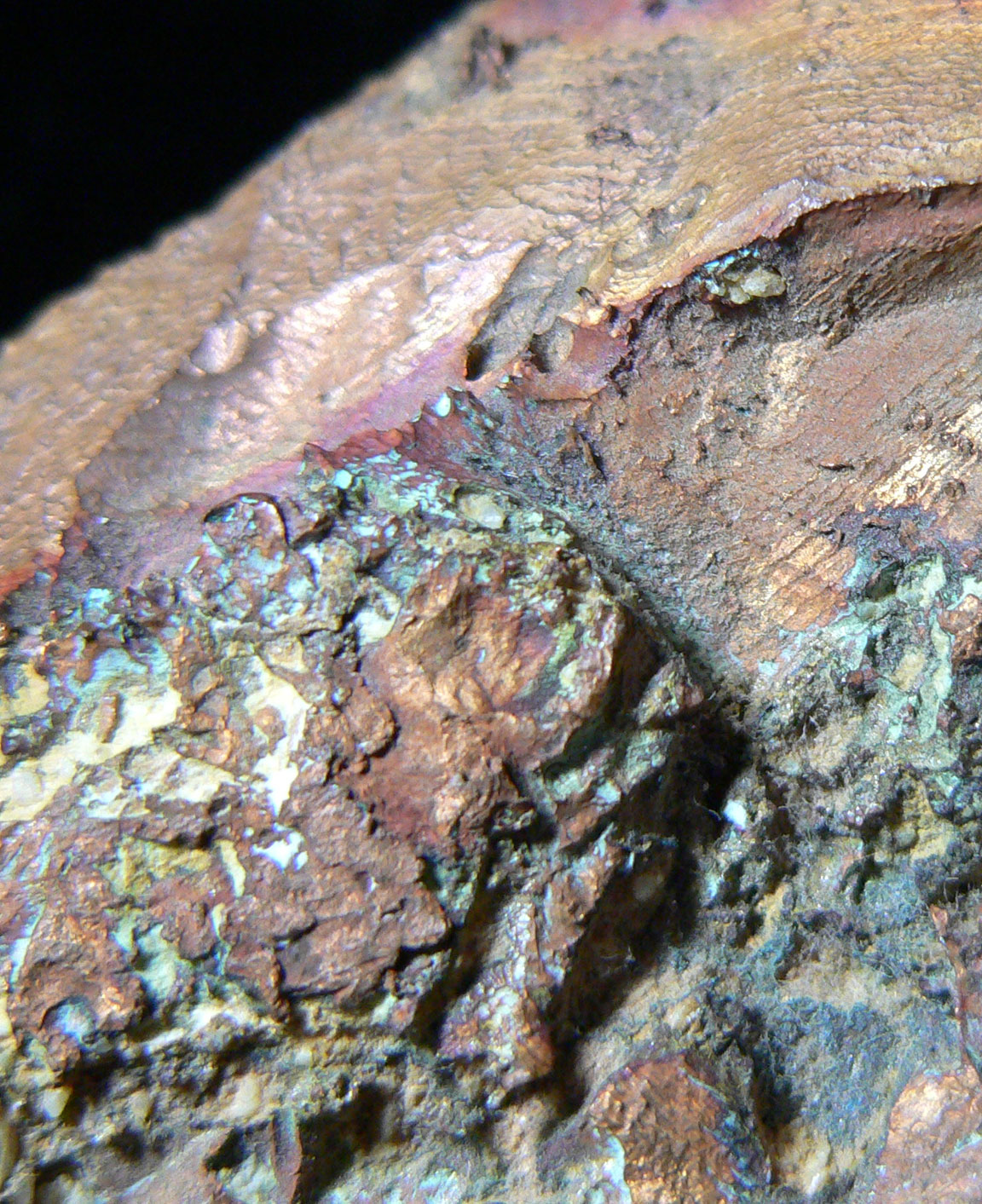 Copper - Silver Half Breed Mineral 1982 A close-up view of the bottom of the specimen showing the silver on and in the the copper. |