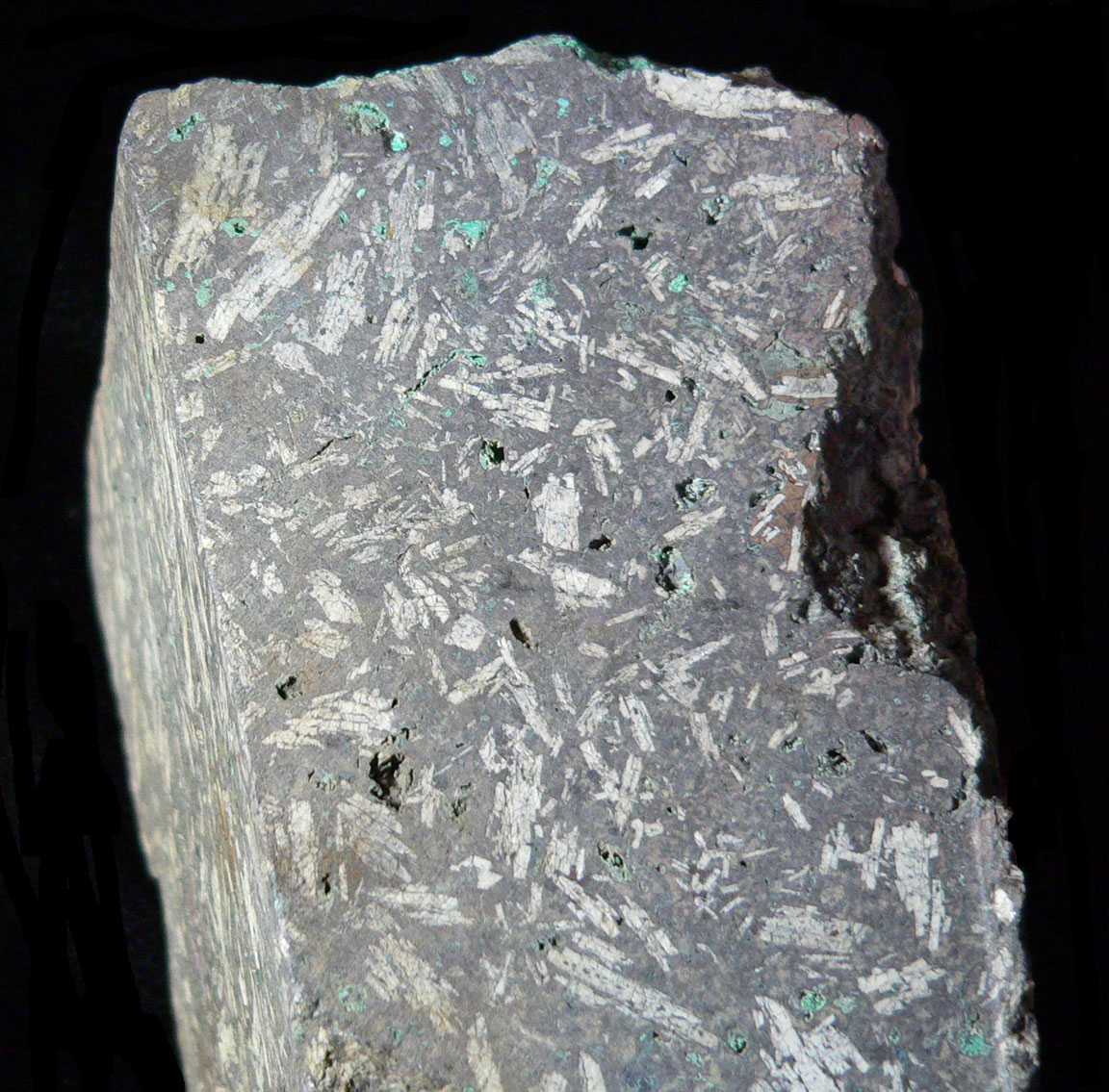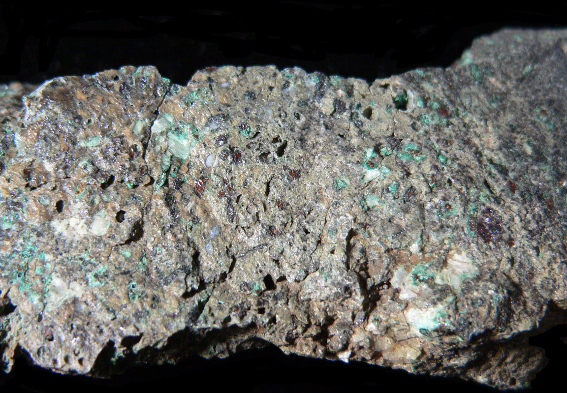 Franke Mine Ore Specimen # 3000 Here is one cut side showing the flecks and occasional malachite in the black atacamite and numerous spaces. On the very left side you can see the other flat cut side show in the image below. Any true white specks you find are gypsum. |