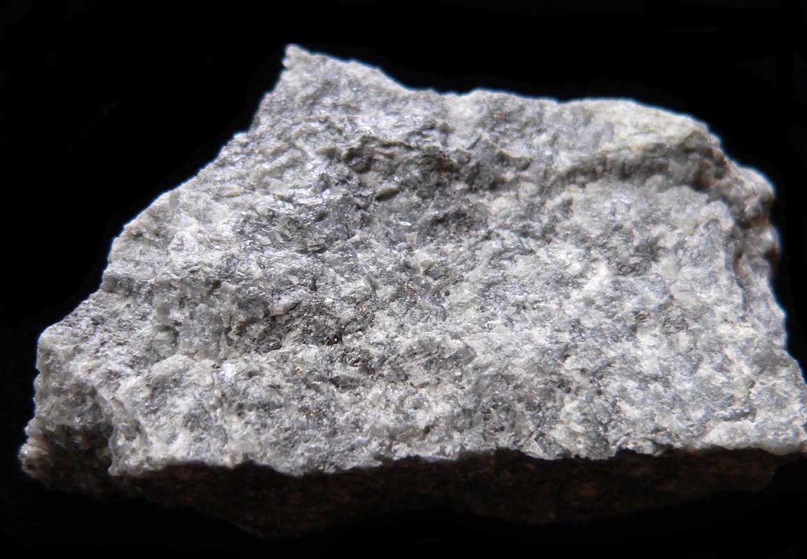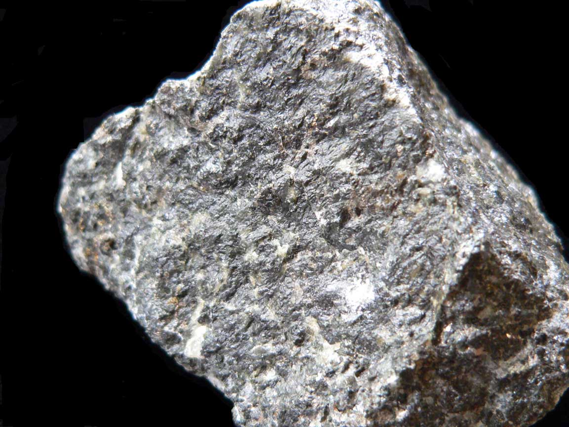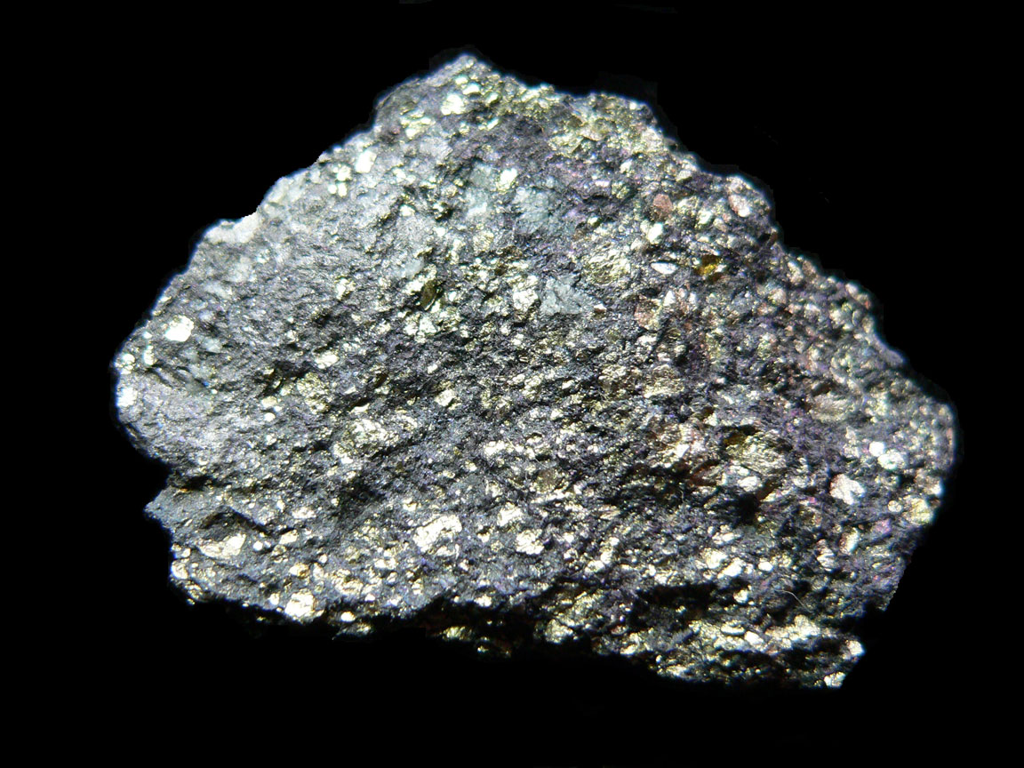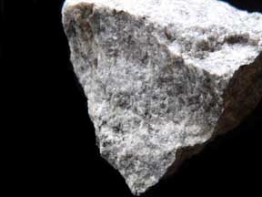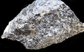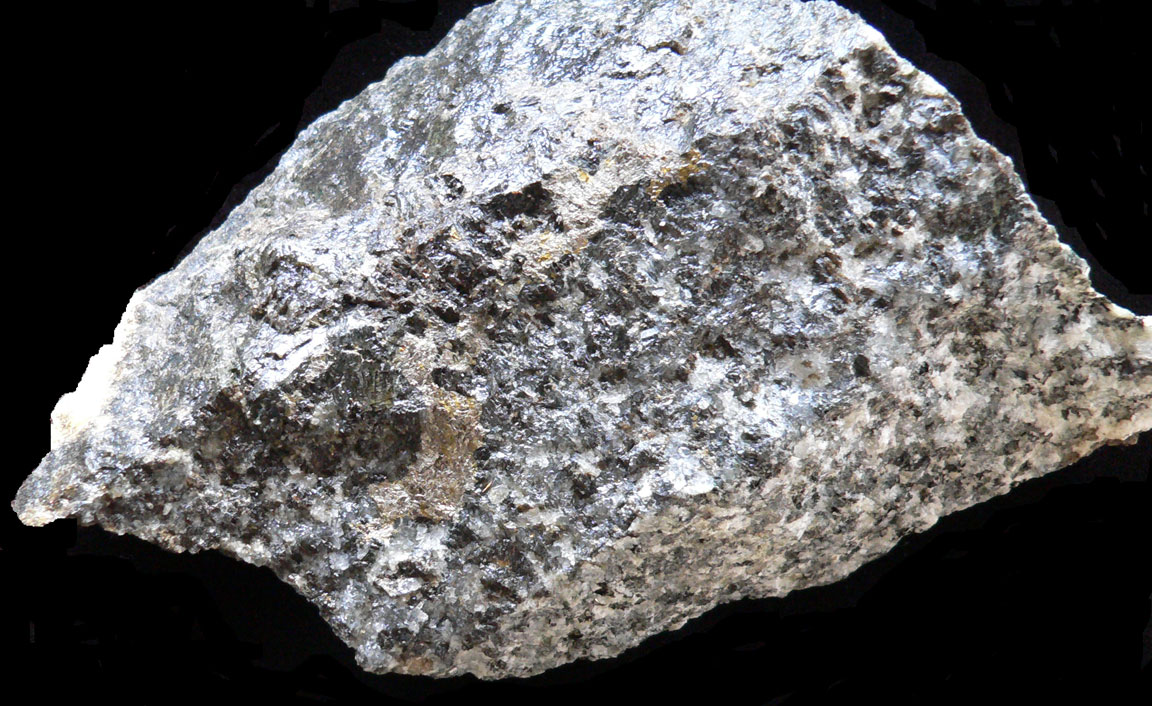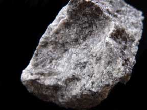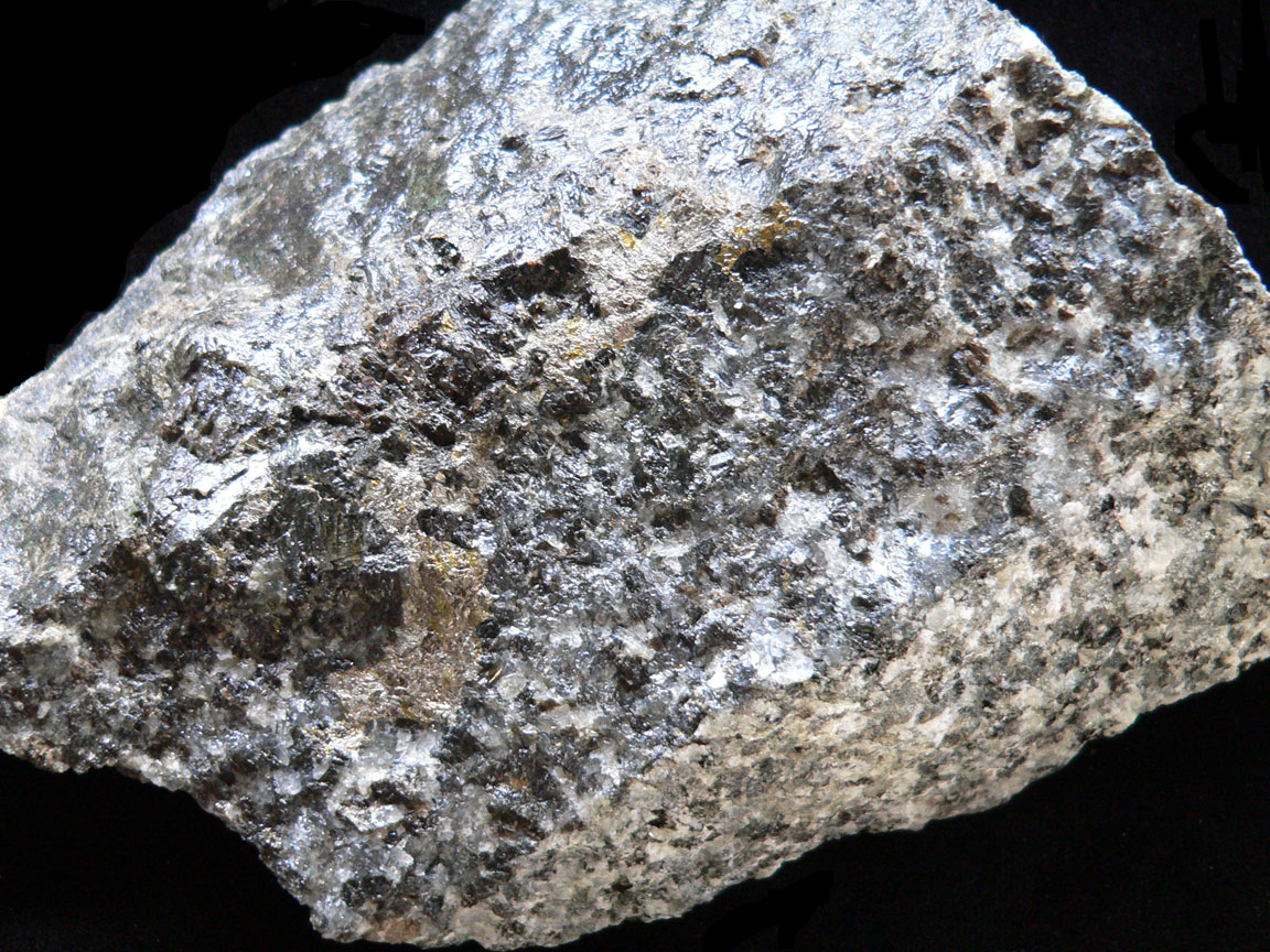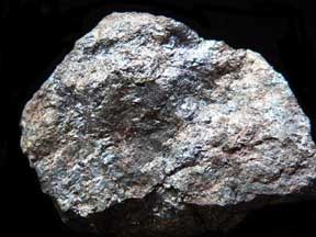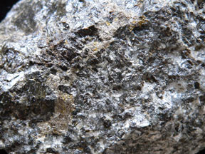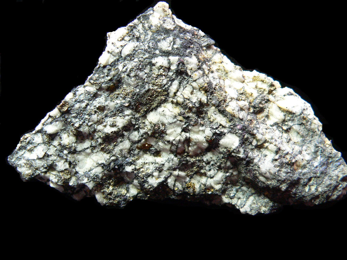 Mine Gabbro, JM Reef, PGE ore Mineral # 724 Plagioclase +/- Augite, Bronzite with sulfides: Chalcopyrite, Pyrrhotite and Pentalandite A closer view of this specimen; look for metallic areas to find the ore which looks a little like copper flecks |