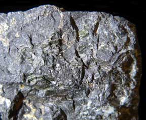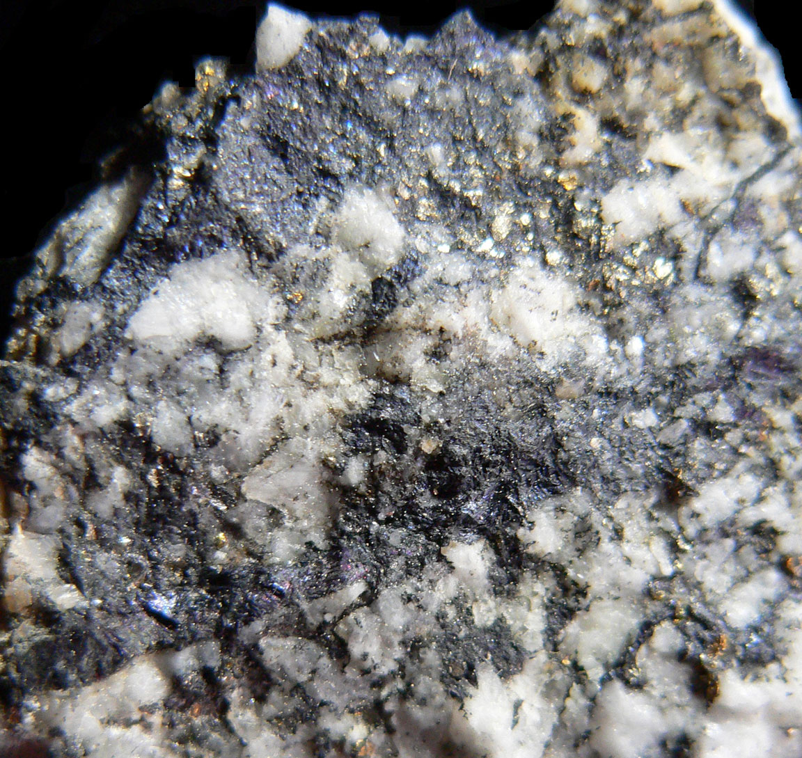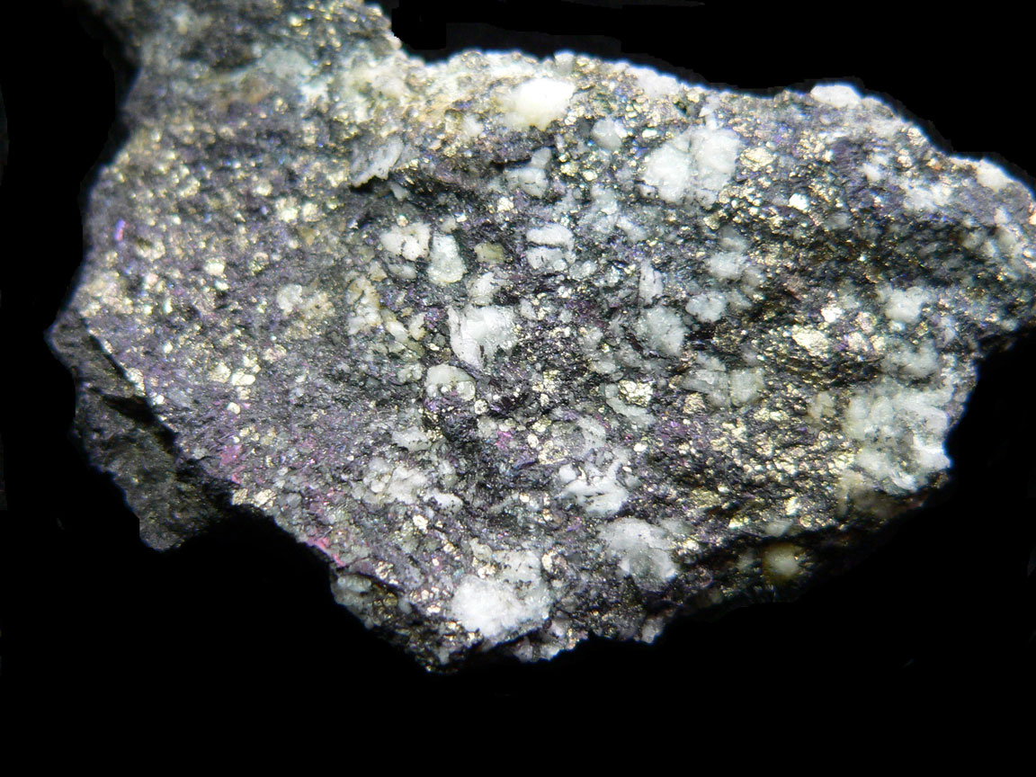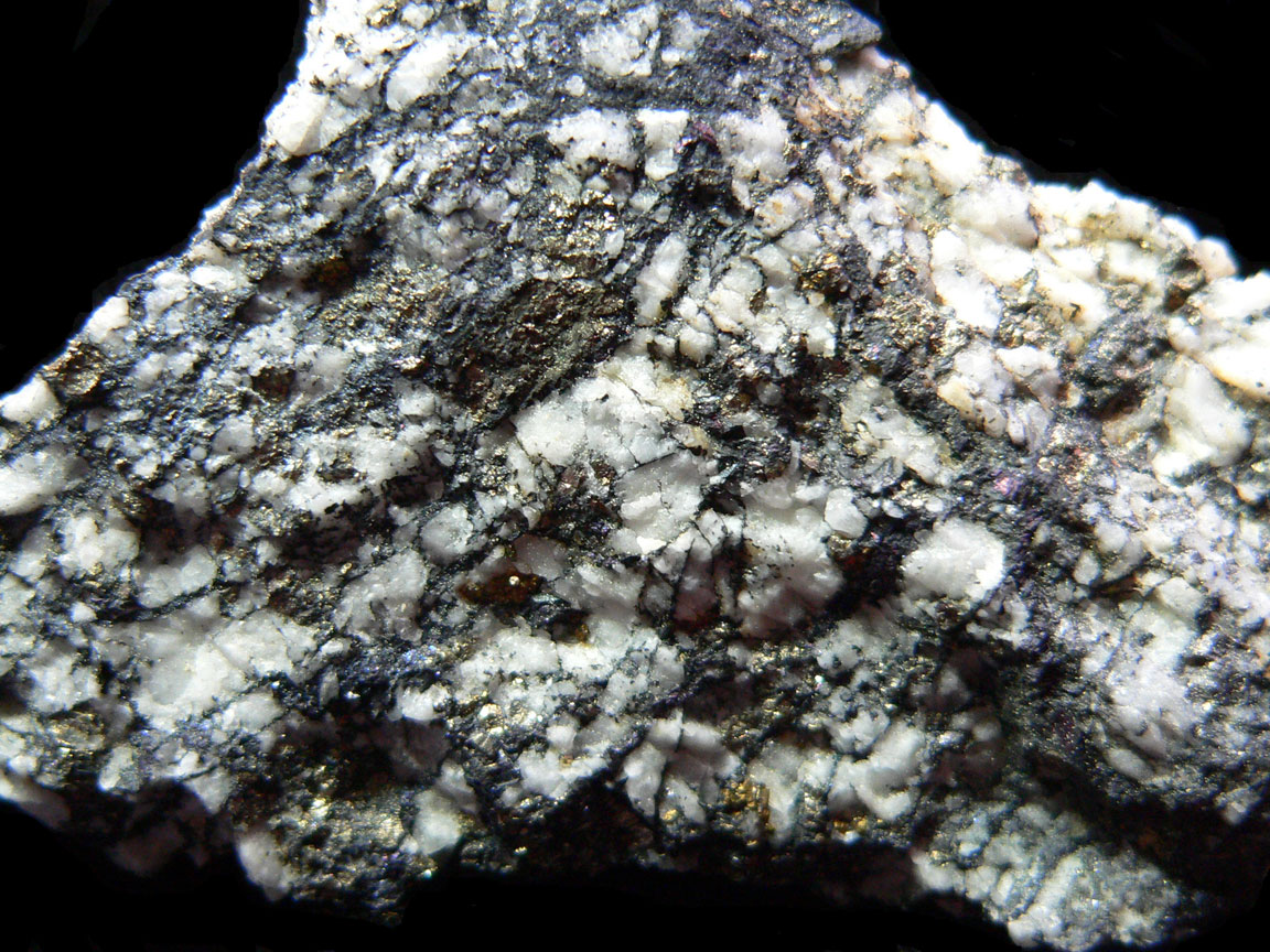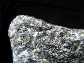 Mine Gabbro, JM Reef, PGE ore Mineral # 725 Plagioclase +/- Augite, Bronzite with sulfides: Chalcopyrite, Pyrrhotite and Pentalandite A very close view of this specimen; note the fuzzy ore that looks like gold |