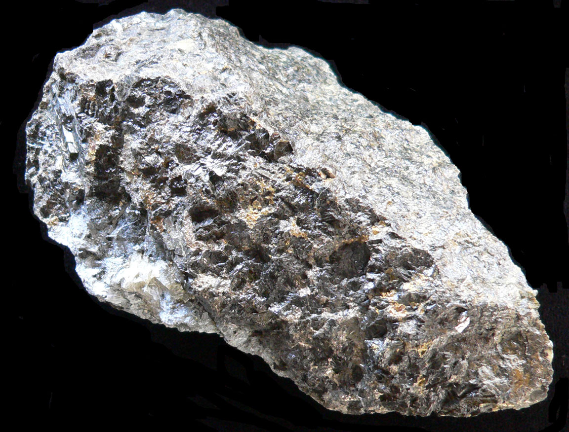 Stillwater Anorthosite; Norite (calcic plagioclase and orthopyroxene) containing sulphides Mineral # 710 Stillwater Mine, Sweet Grass and Park Counties, Montana 7 x 2.5 x 4 cm $ 45 Stillwater Anorthosite contains numerous sulfides containing PGE's (Platinum Ground Elements) |