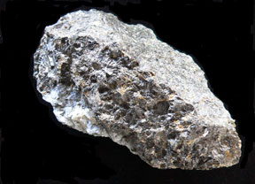 Stillwater Anorthosite; Norite (calcic plagioclase and orthopyroxene) containing sulphides Mineral # 711 Stillwater Mine, Sweet Grass and Park Counties, Montana USA 6 x 4 x 6 cm $ 55 Stillwater Anorthosite contains numerous sulfides appearing as dark sulfide spots which contain the PGE's (Platinum Groundplements) |