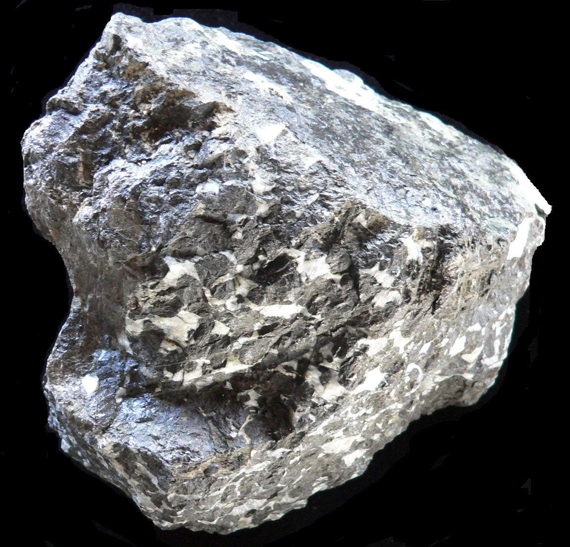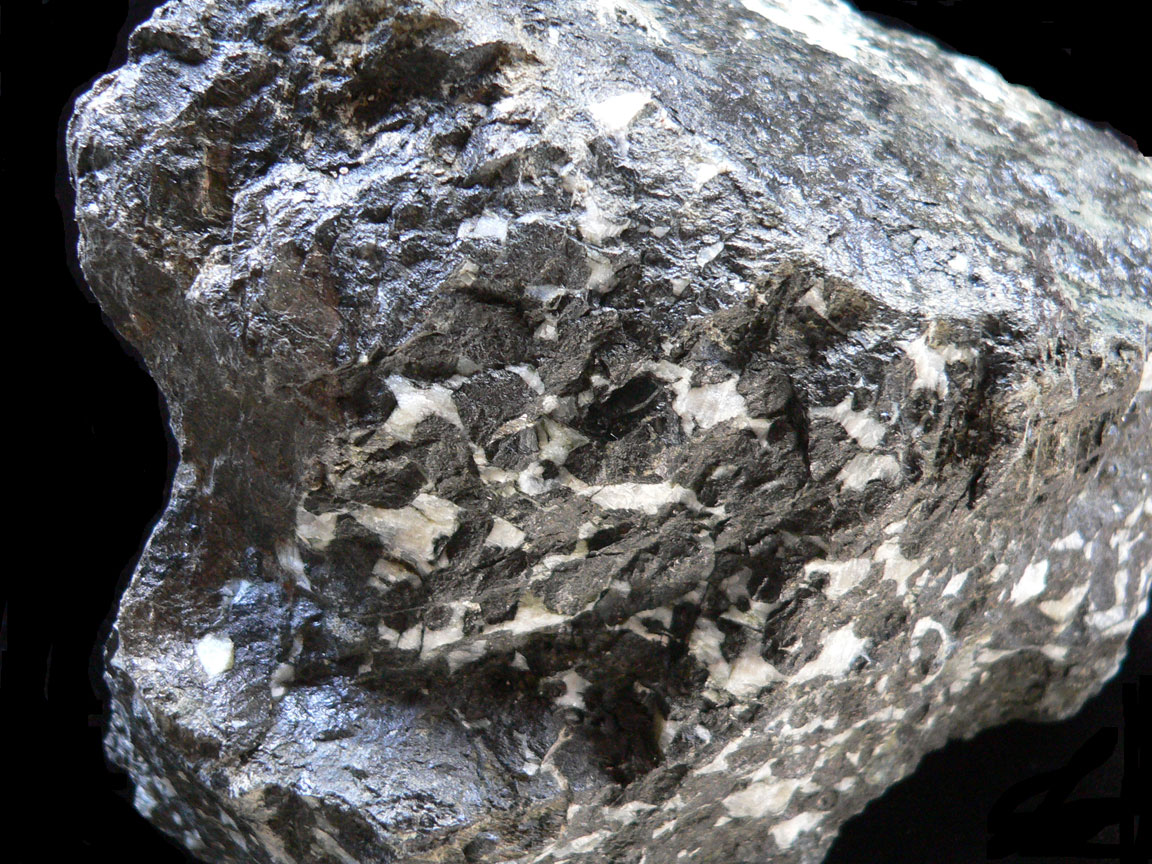 Stillwater Mine Gabbro, JM Reef, PGE ore Mineral # 726 Plagioclase +/- Augite, Bronzite with sulfides: Chalcopyrite, Pyrrhotite and Pentalandite This is a large specimen that is a little different in its striking appearance with black and white contrasts The ore in this specimen is the silver patches in the lower left corner and in the top left also. |