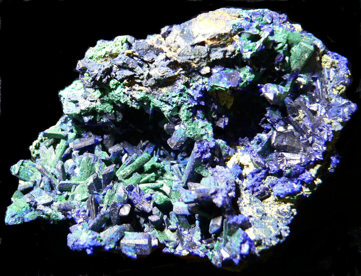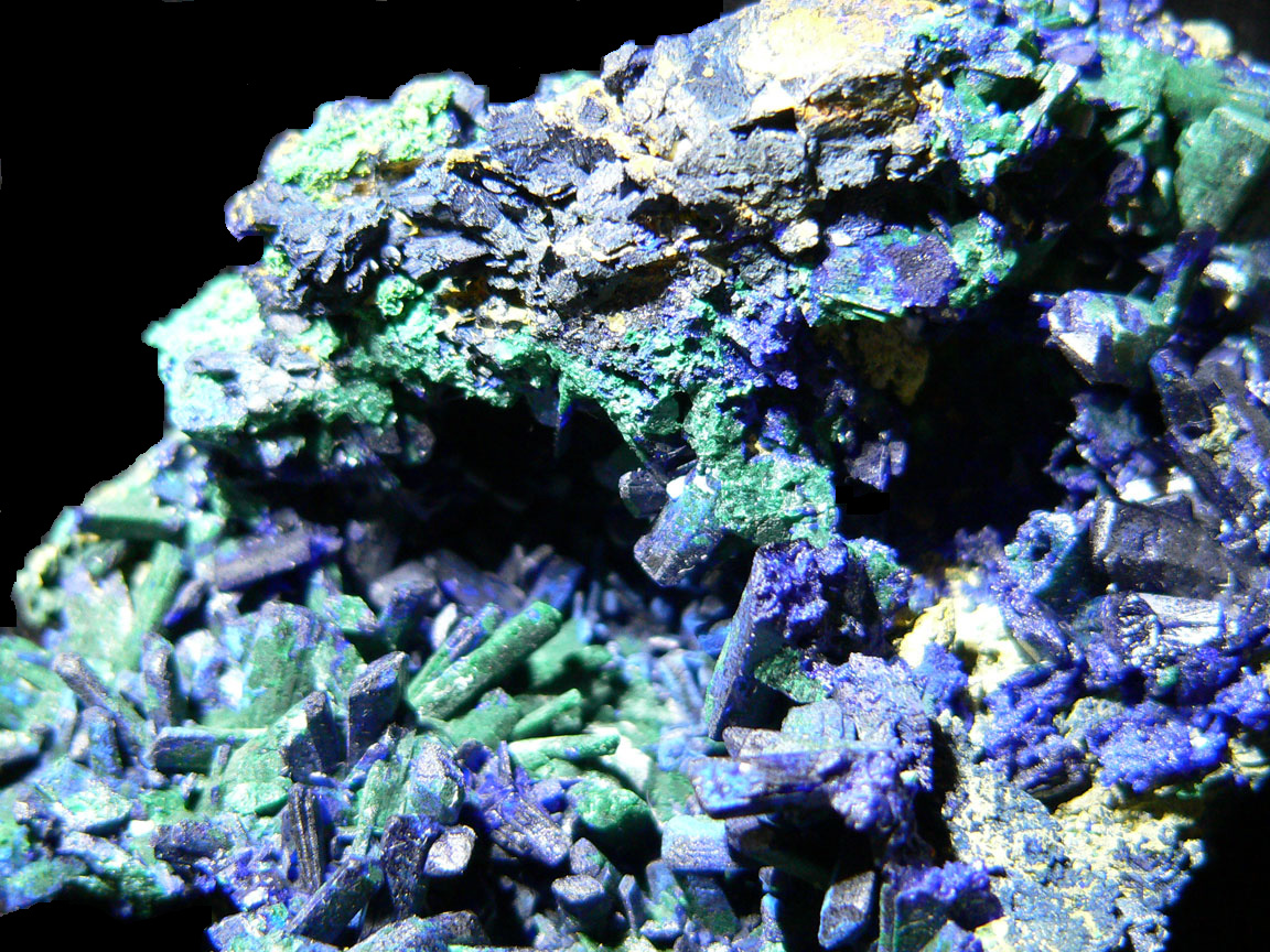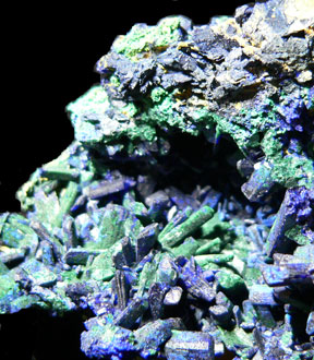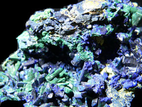 and Malachite pseudomorph Azurite Mineral # 4051 This is a close-up photo of the left side of the specimen; there is a dusting of yellow on the top of the specimen that shows only with bright lighting; the yellow mineralization could be weathered chalcocite or maybe lead arsenate. |