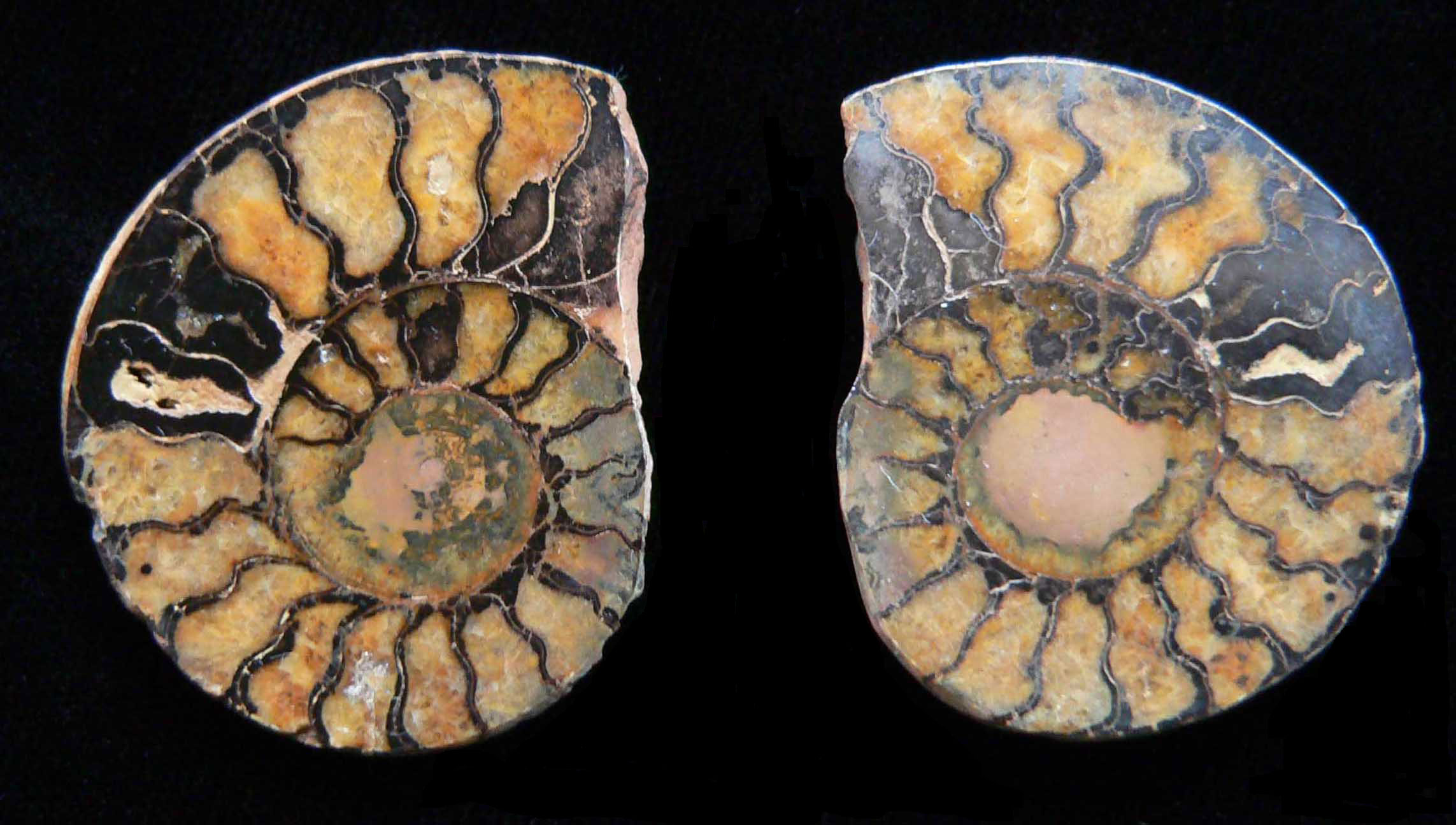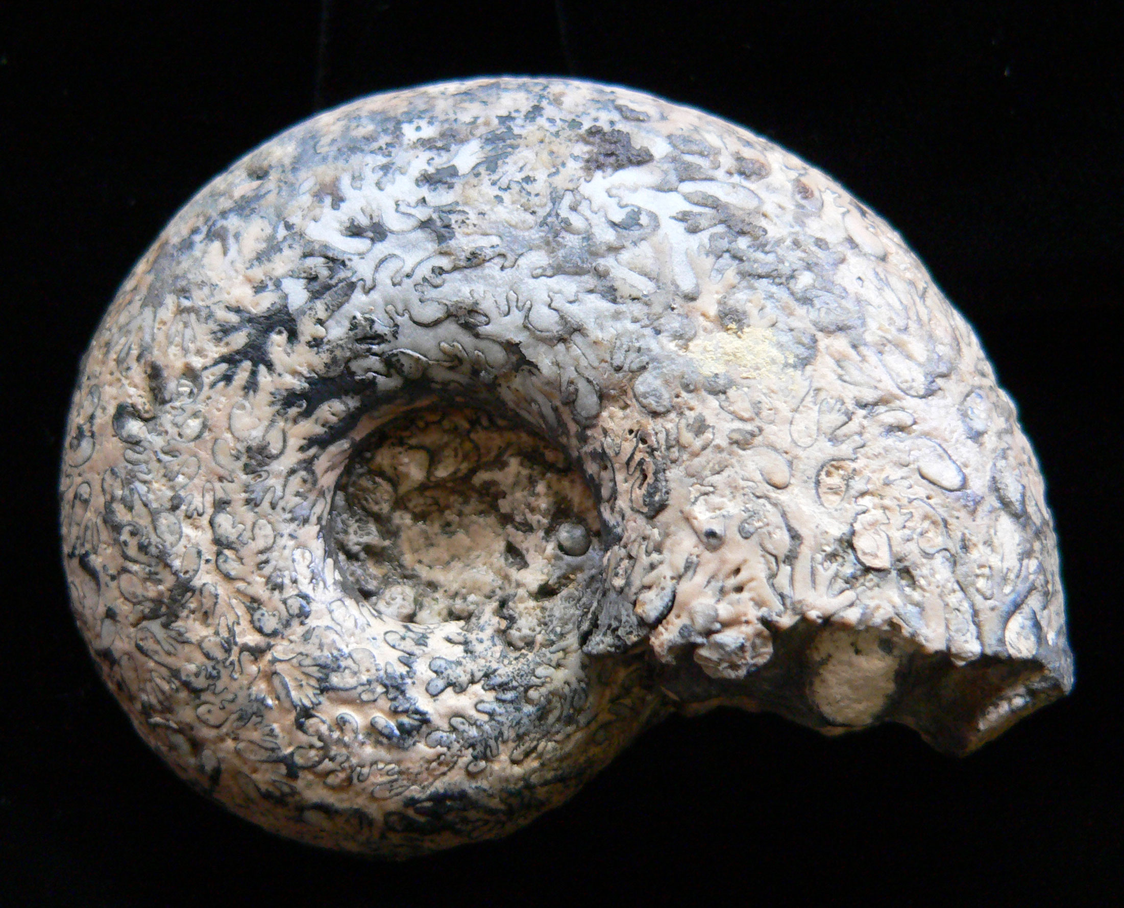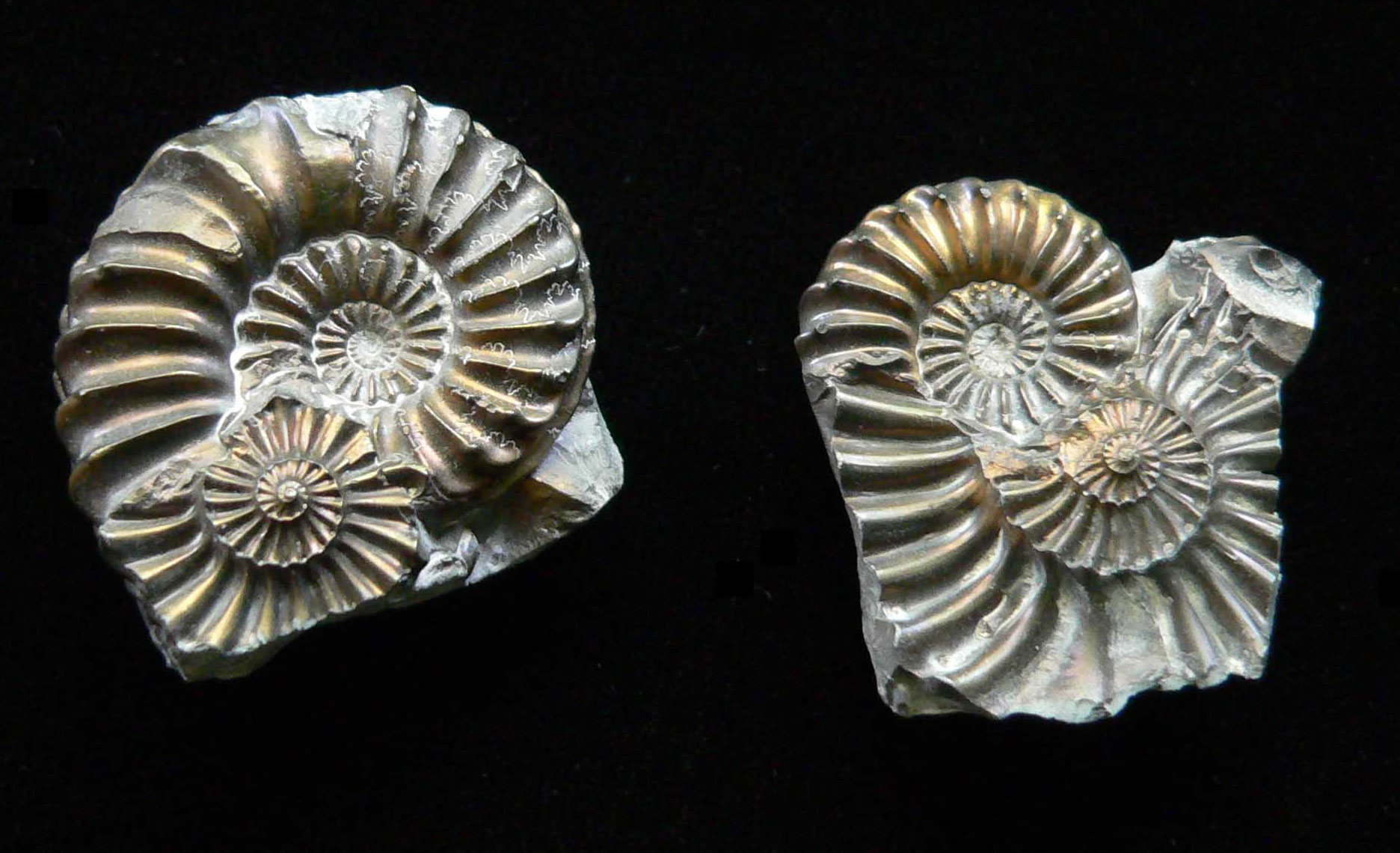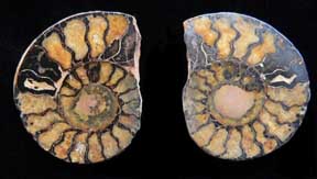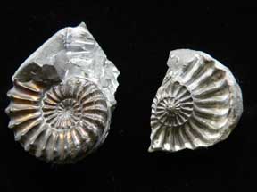 Mollusca 7a Phylum Mollusca Class Cephalopoda Subclass Ammonoidea Family Amaltheidae Genus Pleuroceras Hyatt, 1868 Ammonite: Pleuroceras spinatum Untersturmig, Germany, Jurassic Ammonites replaced by pyrite; solid nodule was broken open to reveal the ammonites; sections fit together like a puzzle; larger ammonite 3.3 cm across $ 60 |