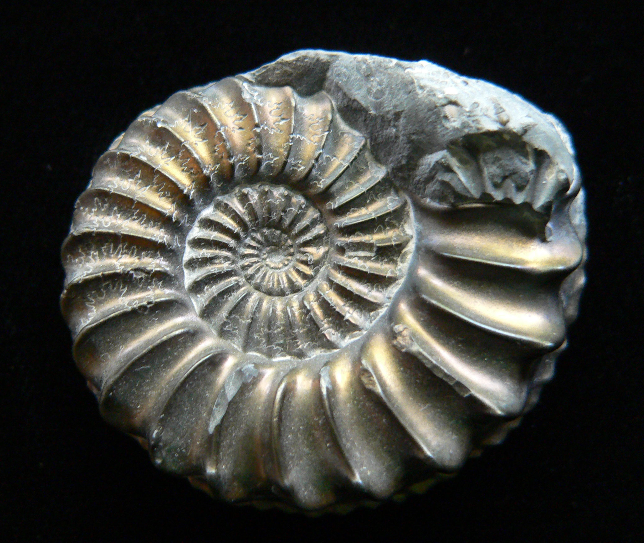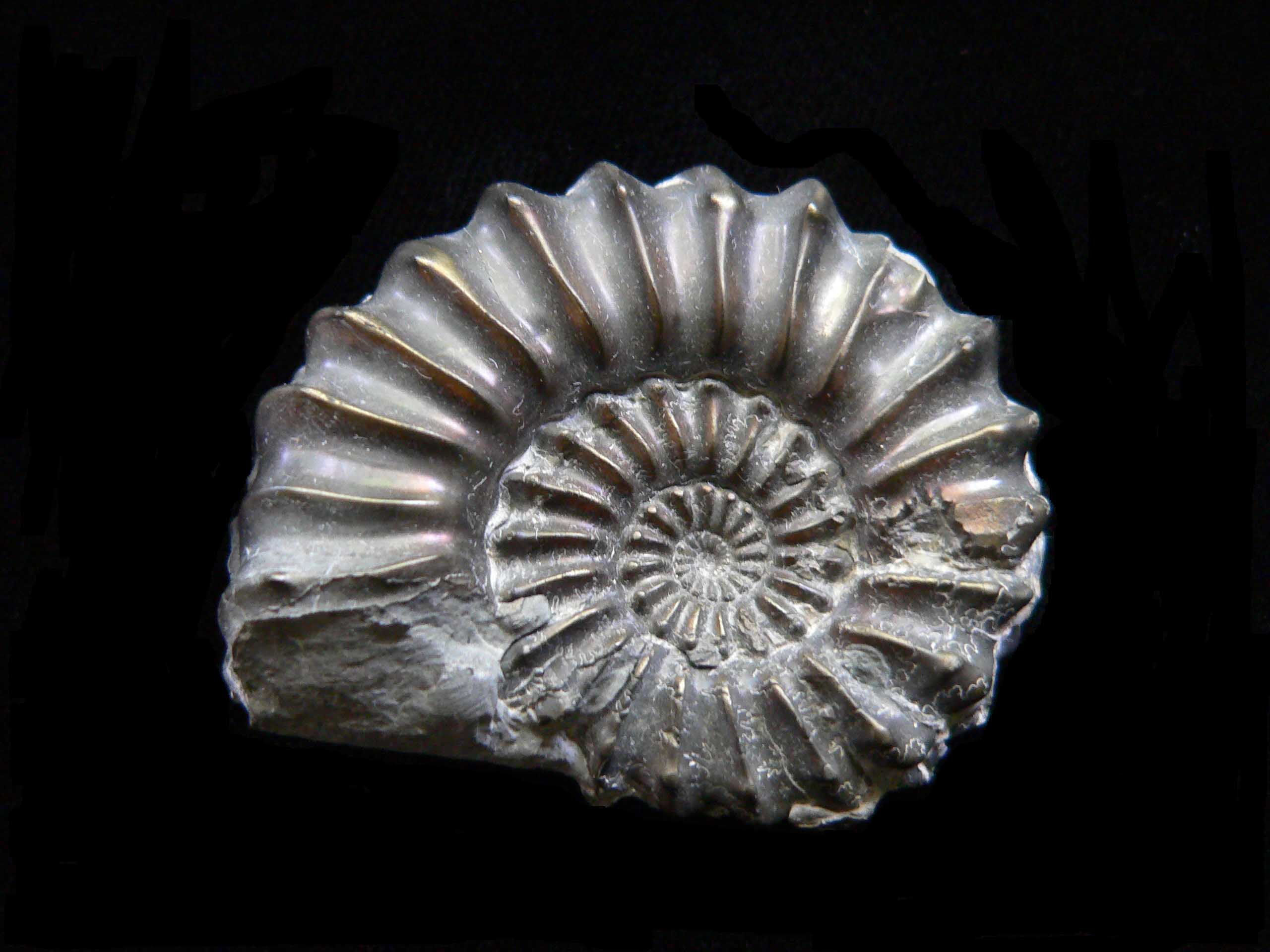 Mollusca 7c Phylum Mollusca Class Cephalopoda Subclass Ammonoidea Family Amaltheidae Genus Pleuroceras Hyatt, 1868 Ammonite: Pleuroceras spinatum Untersturmig, Germany, Jurassic 4 x 4.5 cm Specimen is pyrite replaced as above; underside is covered with rock matrix; excellent detail and fine suture lines $ 45 |