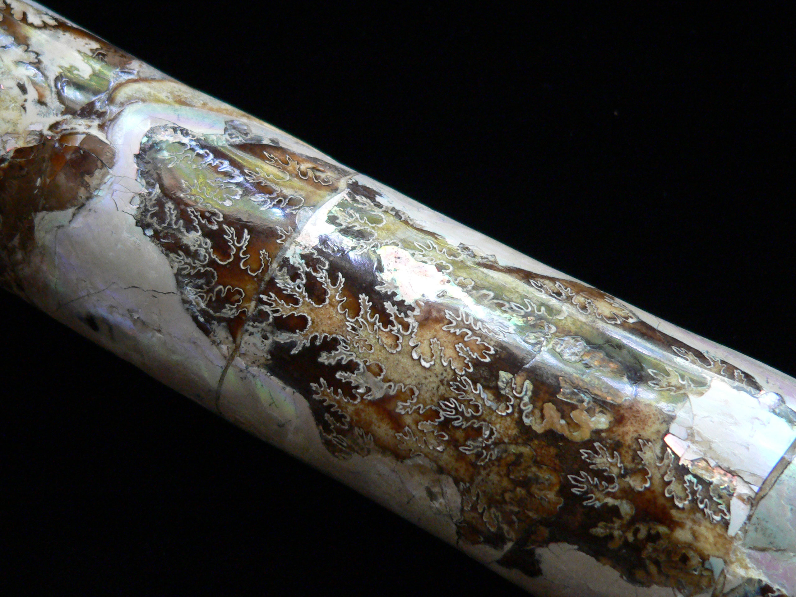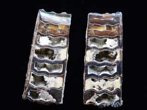 Mollusca 8 Phylum Mollusca Class Cephalopoda Subclass Nautiloidea Order Bactritida Shimanskiy, 1951 Genus: Bactrite Northeast Montana, Cretaceous a matched pair of polished sections (2.5 x 6.6 cm) of a bactrite; shows the fine internal details $ 100 |