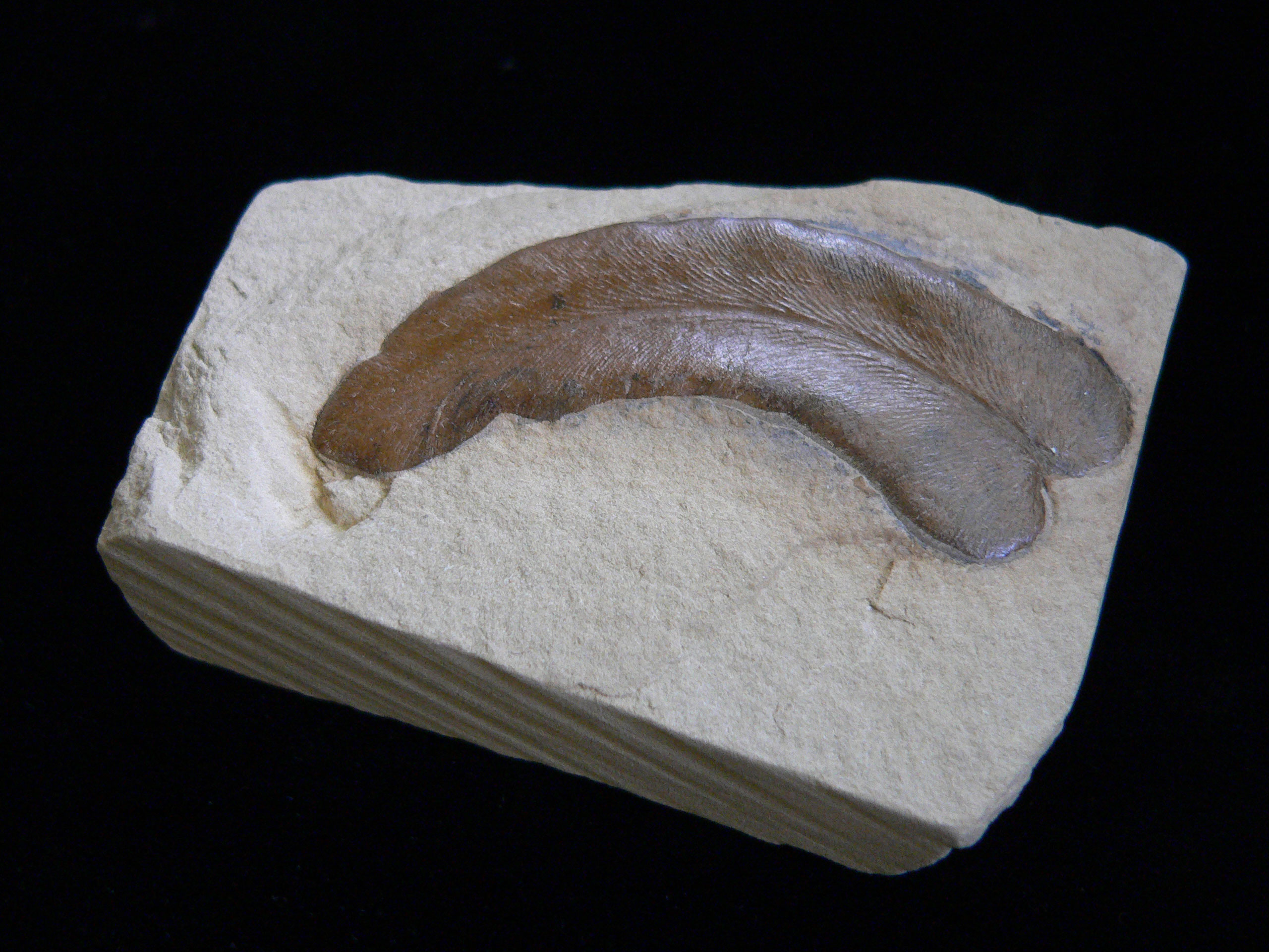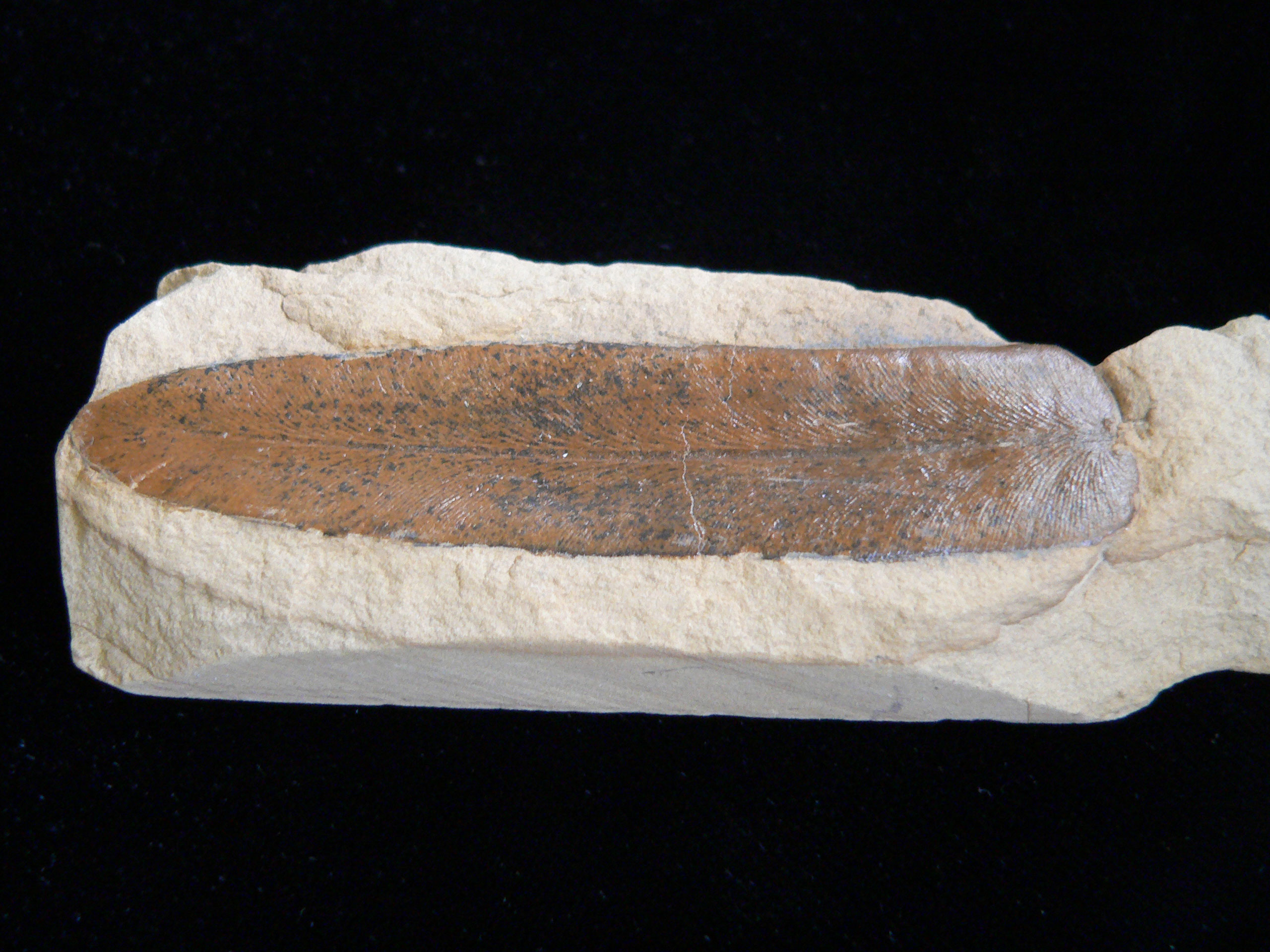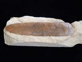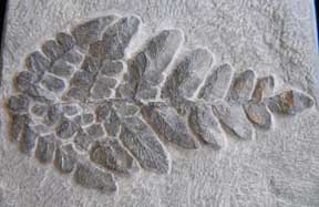 rogersii A 2 x 7.5 cm brown, straight, leaf-like frond on tan rock base |