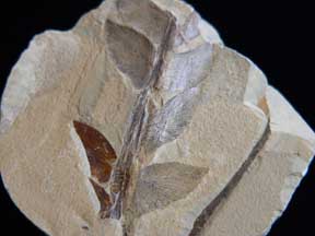 ovata An 8.5 x 8.5 cm black shale slab showing multiple leaves attached to a single stem; other specimens on edge of slab |