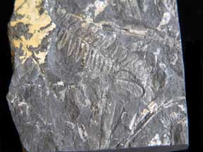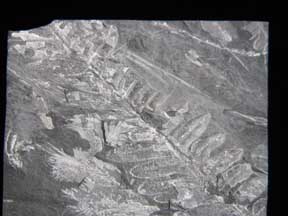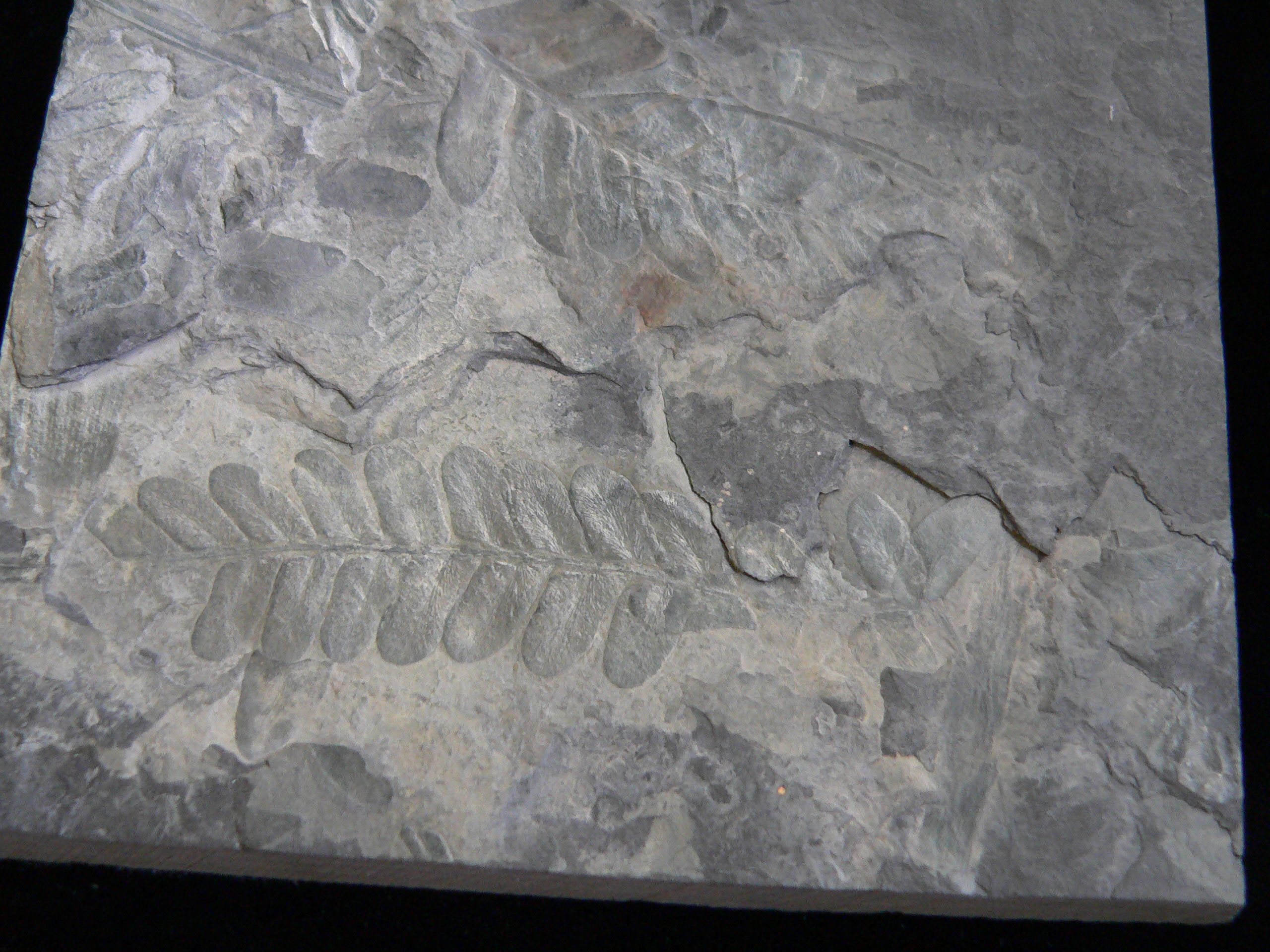 oblique several frondson a 8 x 10 cm dark gray rock slab |