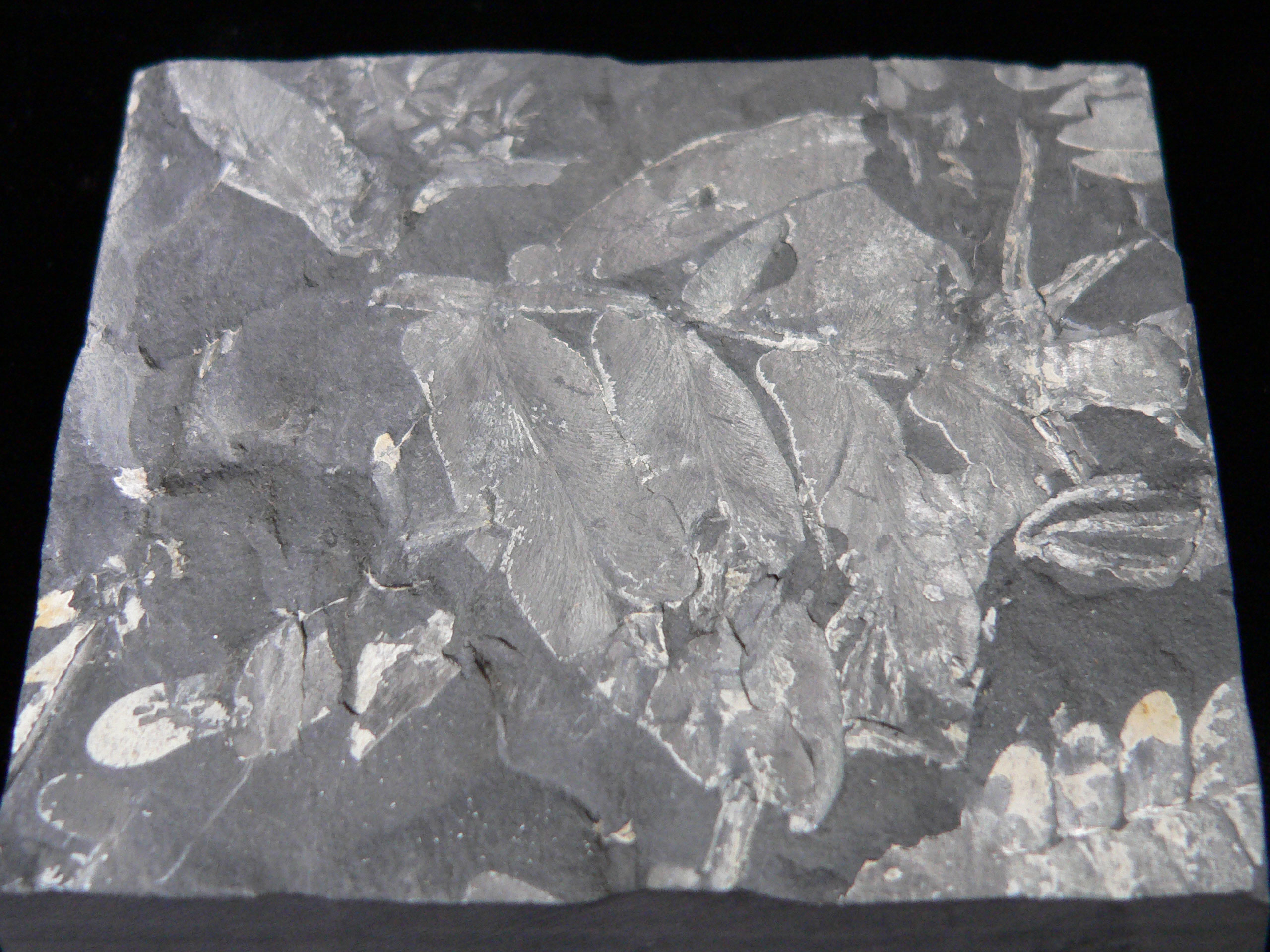 hirsuta frond imprints in several colors (black to olive green) on a 14 x 15cm black shale slab |
