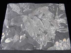 Neuropteris ovata This is a combination of the genera of Cyca 1 and 2 above; frond imprints showing extremely well preserved detail on a 14 x 17.5cm black slab |