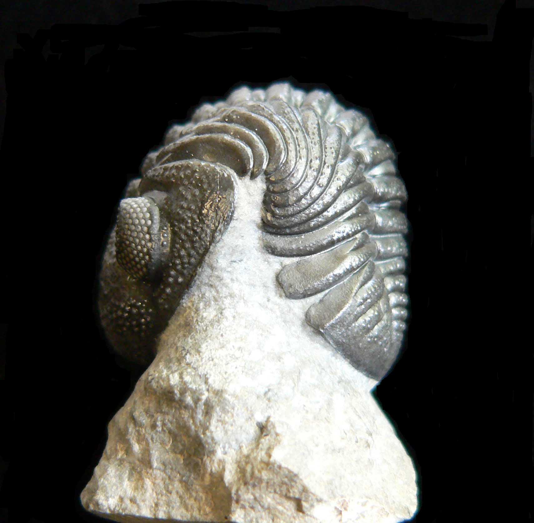 Arth 23 Trilobite Three views of specimen wrapped around matrix Geesops tindoufensis Class Trilobita Walch 1771 Order Phacopida Suborder Phacopina Superfamily Phacopoidea Family Phacopidae Hawle & Corda 1847 size: 2.5 x 5 cm Wenoceras limestone, Smara-Lifariti Morocco middle Devonian $ 650 |