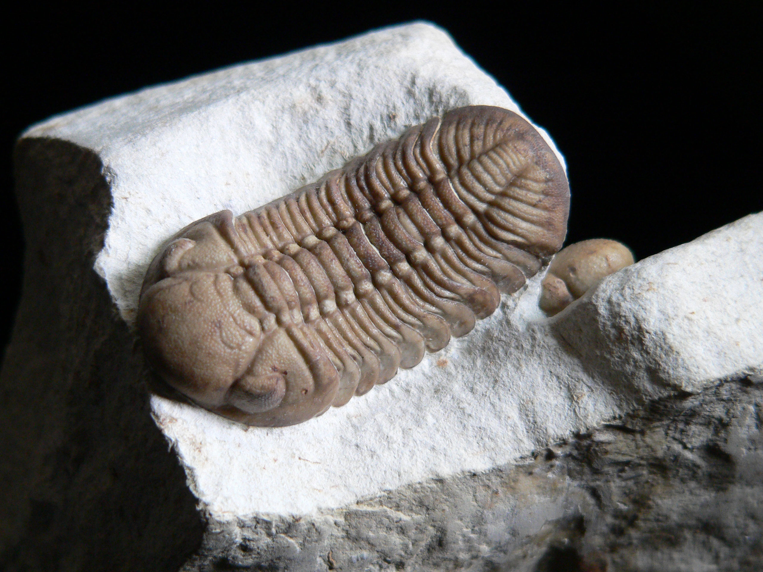 Arth 15 Trilobite, elongate Lochkovella deckeri Delo Class Trilobita Walch 1771 Order Phacopida Suborder Phacopina Family Phacopoidea Hawle & Corda 1847 2.5 x 5 cm Haragan Fm - Hunton Group, Clarita, Coal County Oklahoma USA one complete specimen and one partial on natural matrix lower Devonian (Helderbergian) SOLD |